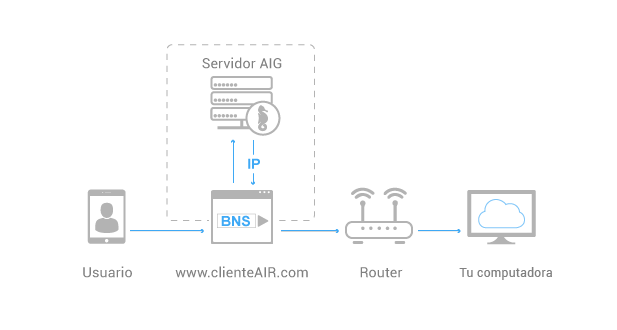 El BNS o servicio Business Name Server es una prestación que ofrece AIG para que puedas conectarte a través de la web con la mayor comodidad. Con el servicio BNS te conectas a clienteair tecleando el nombre que tú decidas como clave; no tienes que averiguar la IP pública asignada a tu router en cada momento ni contratar IP’s fijas.